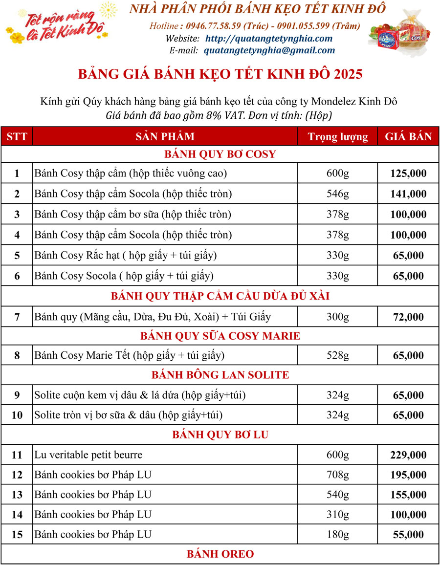 Bảng giá bánh Kinh Đô Tết 2025 chính thức của Tập Đoàn Mondelez Kinh Đô. Bánh LU, bánh Cosy, bánh Oreo giá tốt, hàng mới về, chiết khấu cao, giá ưu đãi cho doanh nghiệp