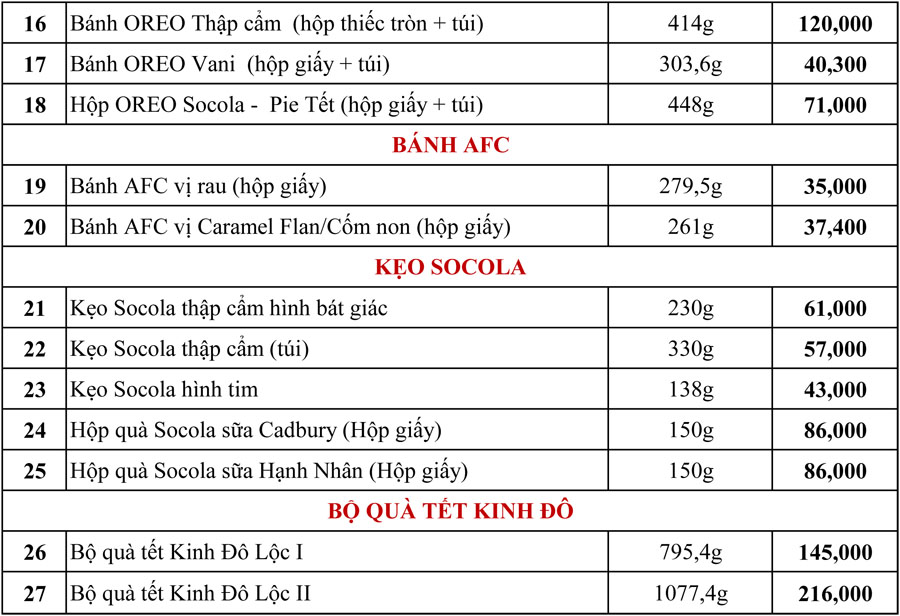 Bảng giá bánh kẹo Tết Kinh Đô 2025