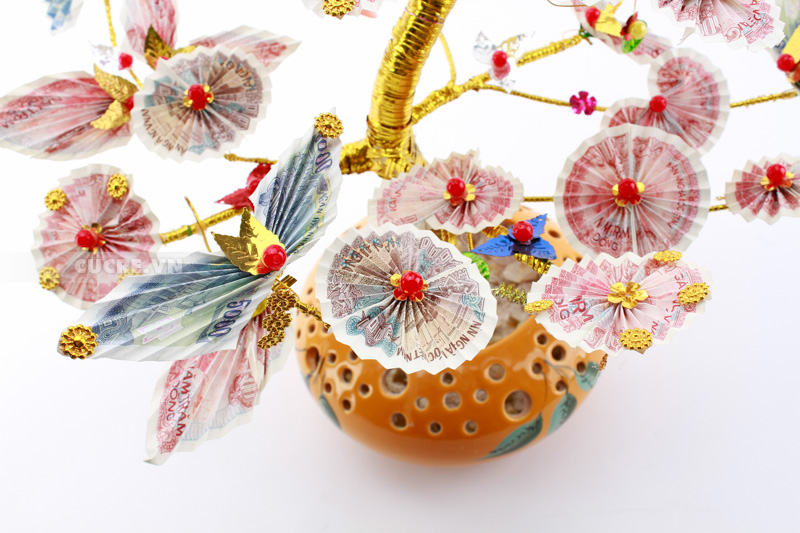 Cây tiền tài lộc phù hợp để trang trí những nơi trang trọng trong gia đình mang ý nghĩa đem đến sự sung túc, đủ đầy về tiền tài, danh vọng, sức khoẻ cho gia chủ. Là sản phẩm thủ công, cao khoảng 70 cm với nguyên liệu chính là tiền giấy thật, dây thép, và một số đồ trang trí. Cây tiền này có thể chơi được lâu, mọi người lại thường quan niệm “Tiểu thần tài” hay “Đại thần tài” sẽ mang đến may mắn cho gia đình.