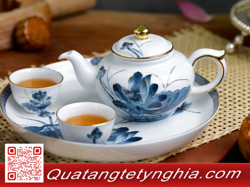 Sen là quốc hoa của dân tộc, bộ bình trà Sen vàng (cỡ nhỏ) trưng bàn ngày Tết mang vẻ đẹp truyền thống nhưng cũng không kém phần hiện đại. Những cánh sen bung tròn, phúc hậu ôm lấy nhụy đã được tái hiện như in bằng màu xanh cobalt đặc trưng. Bên cạnh nhưng đóa sen nở là những búp sen non đang vươn mình khỏe khoắn. Trong những ngày Tết, nhấp vài ngụm trà thơm, ngắm bức tranh thanh bình nhưng tinh tế, cho người thưởng thức thêm thư thái sau bao ngày bộn bề lo toan, để cảm nhận rõ hơn về những dịp an vui đoàn tụ.