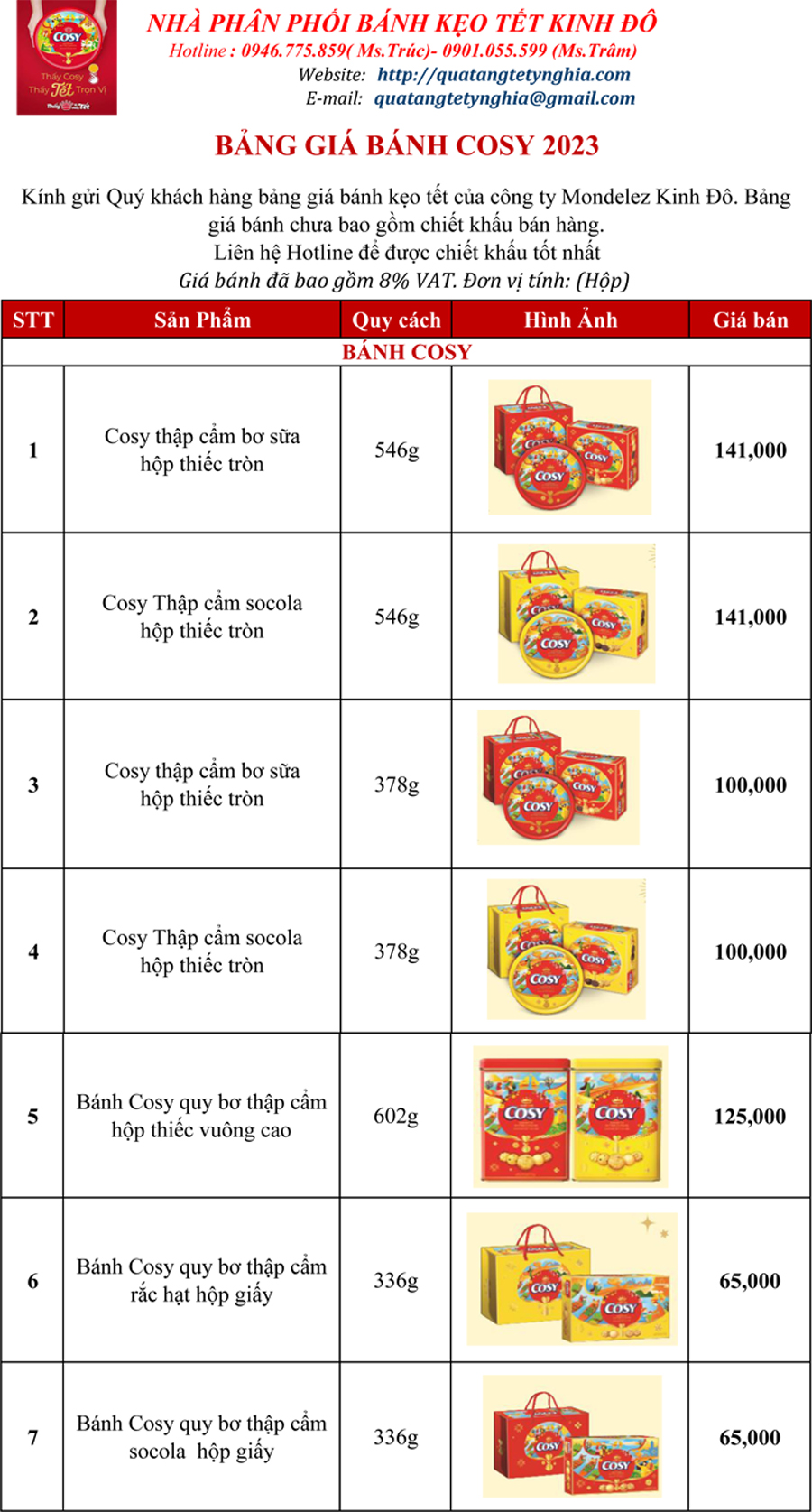 Bảng giá bánh Cosy trên chưa bao gồm chiết khấu cho khách hàng, doanh nghiệp mua số lựơng lớn. Để đặt mua sản phẩm bánh cosy Kinh Đô tết với giá sỉ, chiết khấu ưu đãi, vui lòng liên hệ Hotline hoặc email để được phản hồi ngay bạn nhé!