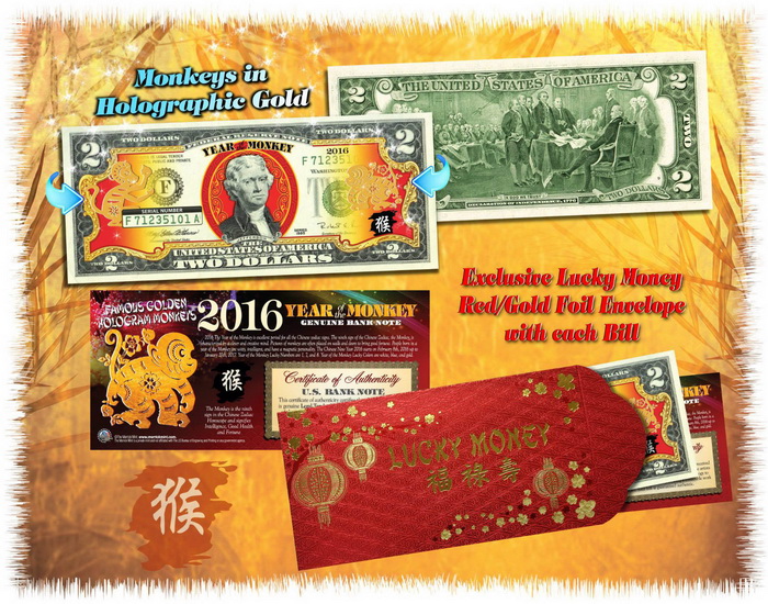Tiền 2 USD in hình con khỉ Mạ Vàng là tờ tiền may mắn, được Bộ Tài Chính Mỹ in ấn và phát hành vào dịp tết Bính Thân 2016. Mục đích phục vụ cho nhu cầu lì xì tết của các nước phương Đông(Châu Á), đây là tờ tiền 2 USD thật năm 2003/2009 nhưng được Mạ Vàng hình con khỉ với nhiều màu sắc và hoa văn tinh tế, nên không có giá trị lưu thông.