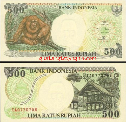 Tiền 500 Rupiah Indonesia là một trong số ít tờ tiền trên thế giới in hình con khỉ. Tờ tiền 500 Rupiah Indonexia này làm bằng chất liệu cotton. Mặt trước in hình chú khỉ vàng Orangutan cộng với màu sắc hài hòa, đường nét tinh tế của tờ tiền, đem lại một vẻ đẹp tự nhiên mà cũng không kém phần đặc biệt.Mặt sau in hình ngôi nhà sàn ở kalimantan Indonesia, cùng với nhiều họa tiết hoa văn đẹp mắt và tinh xảo.